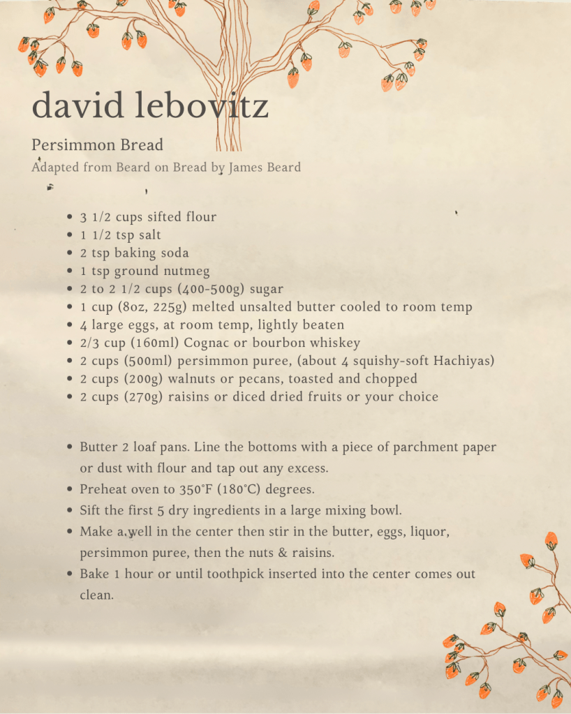 This is the recipe I use for persimmon bread, one of my favorite things to do with our persimmons (I bring it to every holiday party we go to)!