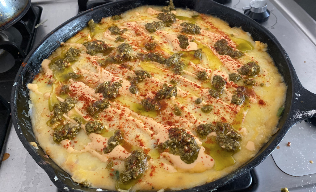 - Dollop with pesto or chimichurri, drizzle tahini or bang bang and olive oil